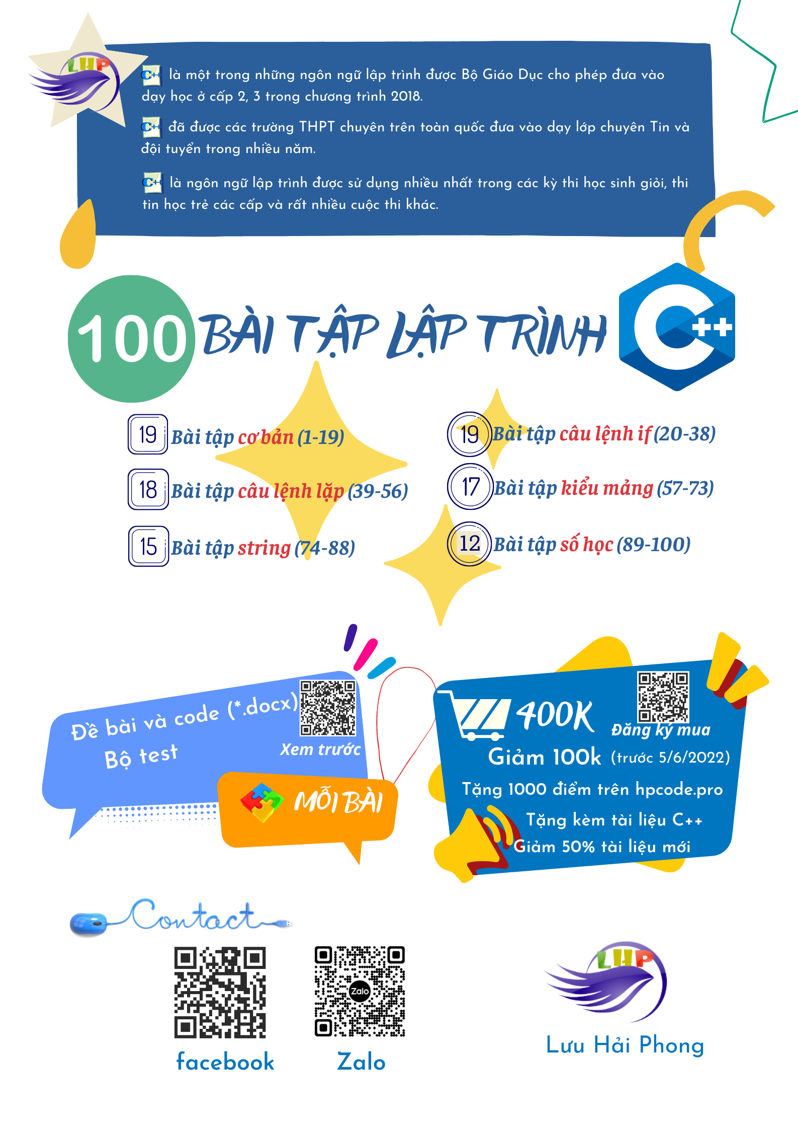 Admin vừa hoàn thành sách: 100 bài tập C++. Các bạn có nhu cầu tham khảo có thể xem thông tin ở hình và đăng ký mua tài liệu.