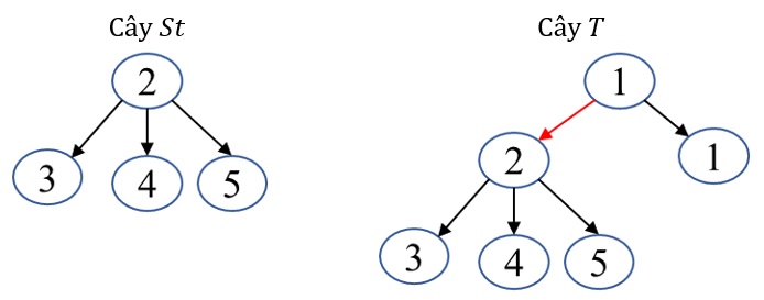Ở hình trên cây \(St\) là cây con của cây \(T\) vì khi xóa cung \((1,2)\) thu được cây có gốc \(v = 2\) giống cây \(St\).