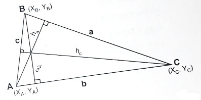 Cho tam giác ABC có tọa độ 3 đỉnh là \(A(x_{a},\ y_{a}),\ B(x_{b},\ y_{b}),C(x_{c},\ y_{c})\) như hình.