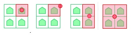 Luke có một tờ giấy kẻ ô vuông với ~ n ~ dòng và ~ m ~ cột, anh ta tưởng tượng rằng có một căn cứ quân đội của quân địch trong mỗi ô vuông. Anh ta sẽ phá hủy hết tất cả các căn cứ của kể thù bằng cách ném bom vào căn cứ. Khi có một quả bom được thả vào trong một ô hoặc ở biên hoặc ở gốc của ô nào thì xem như căn cứ quân sự ở ô đó bị phá hủy. Ví dụ về các trường hợp căn cứ bị phá hủy như hình dưới: